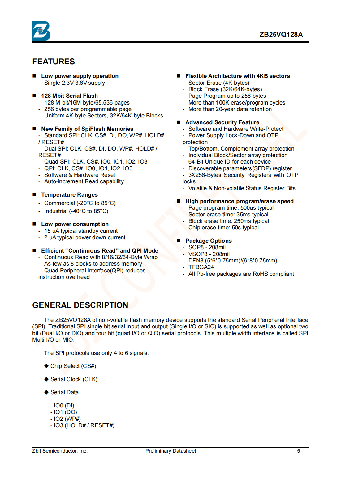 The ZB25VQ128A of non-volatile flash memory device supports the standard Serial Peripheral Interface (SPI)